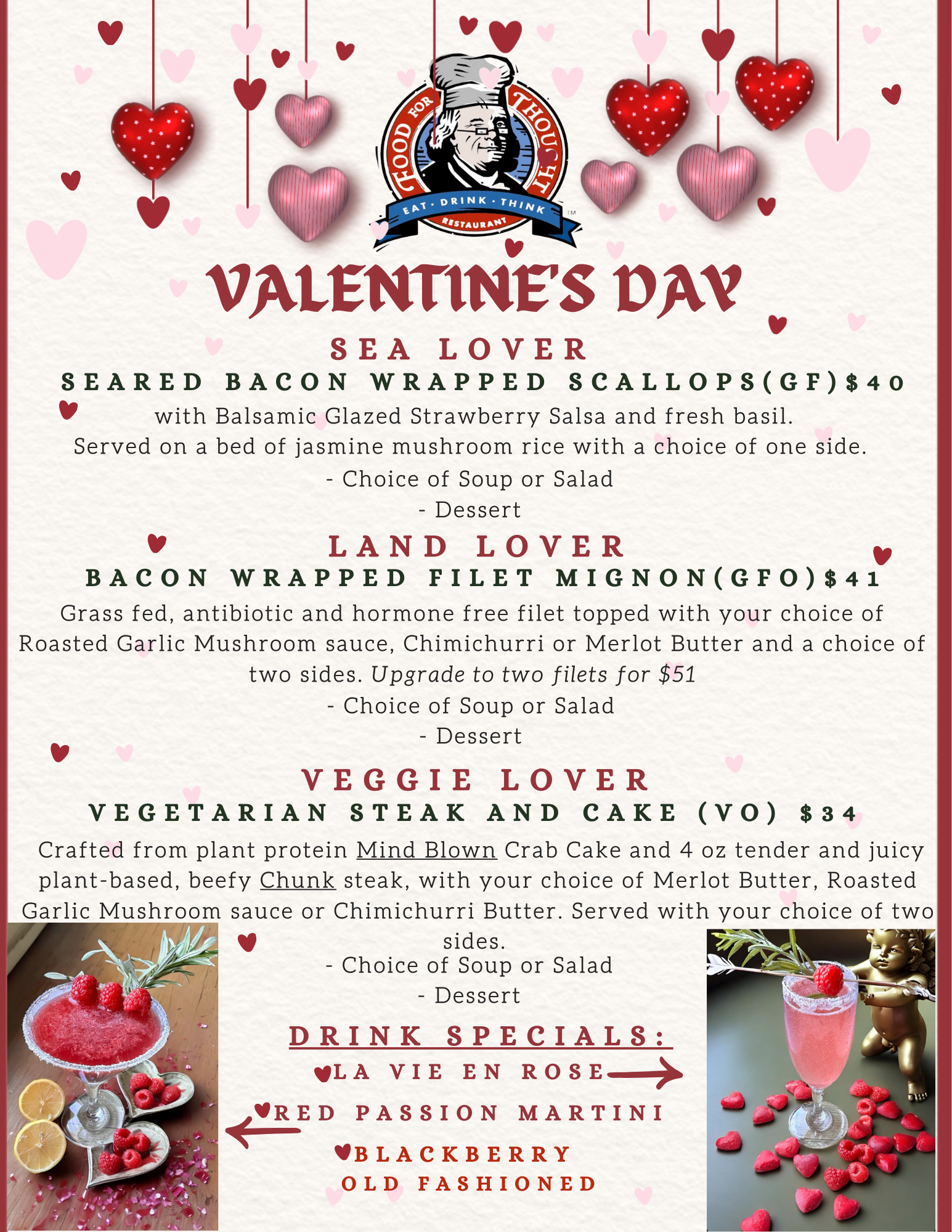 Our Valentine’s Day Menu will be available on Saturday February 14th (packages and a la carte) and Sunday, February 15th ( a la carte meals only). We also will be offering our full menu.